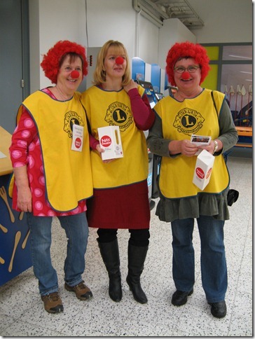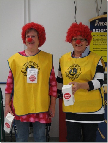 Iloiset ja värikkäästi pukeutneet nenäpäväkerääjät S-markitin aulassa.