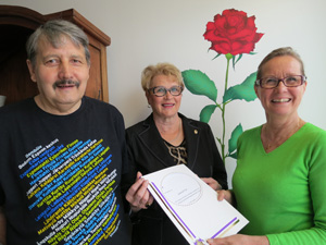 Lahjoituksen luovutustilaisuudessa otetussa yhteiskuvassa Anne Vähäkylä-Aulo (oik.), Laila Jokiniemi ja Pertti Hakamäki.