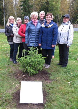Kuva 1 Toimitusjohtaja Pihla Linnainmaa (takana keskellä) asettui kuusen istutuksen jälkeen yhteiskuvaan Paratiisileijonien Helena Vaahtojärven (vas.), Leena Nuotion, Aila Niemisen, Liisa Laukamon, Outi Kolattu-Tolvin ja Ritva Nylundin kanssa. |