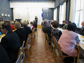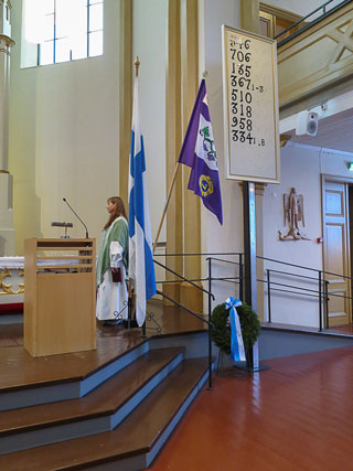 Someron kirkossa vietetyssä messussa saarnasi Paratiisileijonien jäsen, seurakuntapastori Saara Roto (kuva 1) klubin muiden jäsenten toimiessa avustavissa tehtävissä tekstien lukijoina ja kolehdin kerääjinä. Messun jälkeen oli vuorossa kunniakäynti (kuva 2) Someron sankarihautausmaalla, jossa lepää noin 280 sankarivainajaa. Sankaripatsaalle suoritetun seppeleen laskun (kuva 3), pastori Jouni Salkon puheenvuoron ja Jumala ompi linnamme -virren jälkeen väki siirtyi Paratiisileijonien tarjoamalle kirkkokahville (kuva 4).